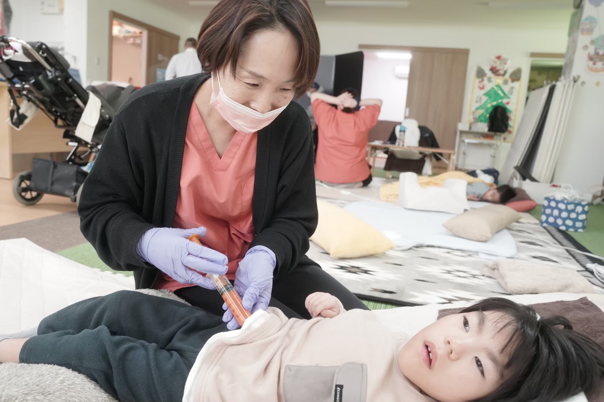 ※主に重症心身障がい児、医療的ケアの必要な0歳〜18歳までの児童さんを1日5名程度お預かりし、医療的ケアをはじめ、楽しく安全にケアが受けられるよ支援を行っていただきます。
