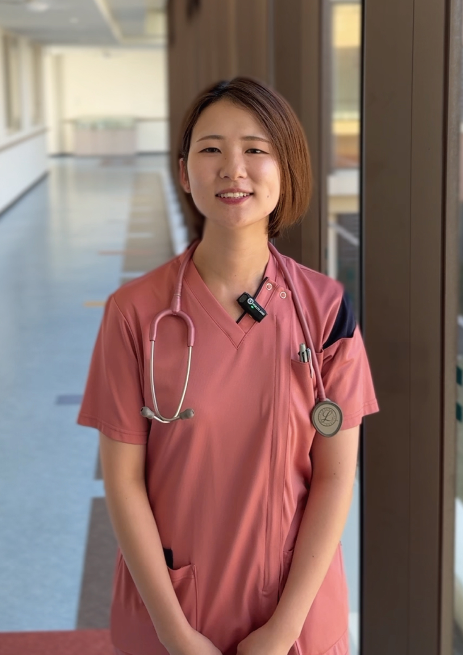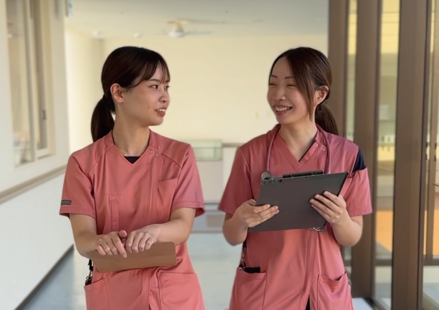 私たち聖ルチア病院は、全病棟開放型の精神科病院として、患者さまはもちろん職員にとっても開放的で過ごしやすい環境を提供しています。中庭側が全面ガラス張りで、どの病棟からも日差しや中庭、青空が見渡せるため、閉塞感がなく、心地よく働ける空間が広がっています。