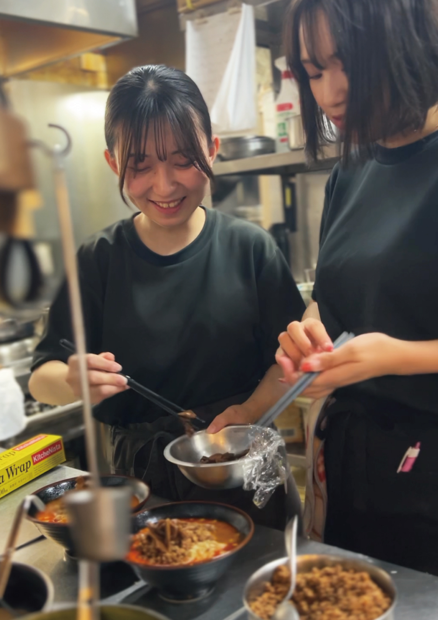 [夜厨房担当]主に火を使わない材料の仕込み(野菜を切る、エビの殻剥き等)です。注文が来たら麺を作り、サラダや前菜を盛り付けや皿洗い等を行なって頂きます。また、営業終わりの厨房機器の洗浄などもあります。
