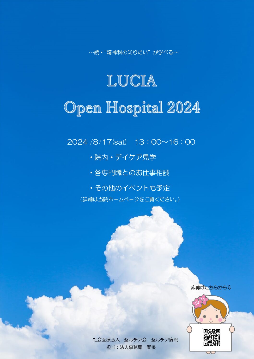 聖ルチア病院さんでは、令和6年8月17日(土)に~続・精神科の知りたいが学べる~ LUCIA Open Hospital2024が開催されます。